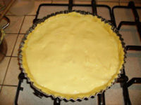 Dopo aver preparato la crema pasticcera e la pasta frolla, stendiamo quest'ultima nella teglia da crostata, aiutandoci con le mani. Versiamoci sopra la crema e ricopriamo con le classiche "striscioline" di pasta per formare la griglia (che purtroppo non ho potuto fotografare :D)