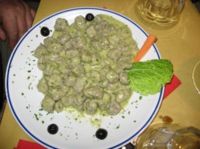 Una fresca insalata di mare, con gamberi e calamari, patate novelle, pomodorini e olive, servita su un letto di insalata verde e condita con leggero pesto di basilico, senza aglio e formaggio. [...]