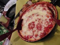 パンチェッタ入りトマトソースであえて、チーズを下ろし石窯へ。
