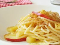 Vengono anche chiamati Spaghetti Dolci e non a caso. Le mele cotte infatti, conferiscono una leggera dolcezza al piatto e la cannella la sottilinea. Un connubio noto e dal profumo intenso, utilizzato spesso e soprattutto nelle preparazioni dolci ma che conferma la sua golosità anche in un piatto salato. A completare i pinoli con il loro gusto delicato e inconfondibile.