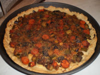 Dopo una lunga giornata di lavoro per me non c’è nulla di meglio che preparare una buona cenetta!Per prima cosa do una sbirciatina al frigorifero, che però mi delude, è in sostanza vuoto!Cerco di salvare il salvabile e inizio a dar sfogo alla mia fantasia, alla fine decido di preparare una pasta brisè farcendola con tutte verdure che ho a disposizione.Eccovi il risultato!Ingredienti:300 gr. di farina150 gr. di burrosale q.b.acqua q.b.1 zucchina1 melanzana 3 carote piccolepan grattato parmigiano grattugiato