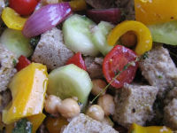 Ingredienti: pane a lievitazione naturale (preferibilmente ai cereali), cetriolo, peperone, pomodori saporiti (ok i pomodorini), ceci lessi, cipolla, erbe aromatiche fresche (basilico, origano, tim [...leggi]
