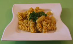 Frullare i peperoni come una crema, .scolare i fusilli e condirli, decorando il piatto con capperi e basilico.