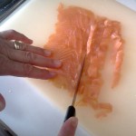 Tagliare in pezzi piccolissimi il salmone e mescolarlo alle patate. Quindi aggiungere le uova sbatutte, salare, pepare e amalgamare bene.