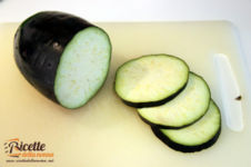 Prendete una melanzana e tagliatela nel senso della larghezza in tanti dischi di circa mezzo centimetro.