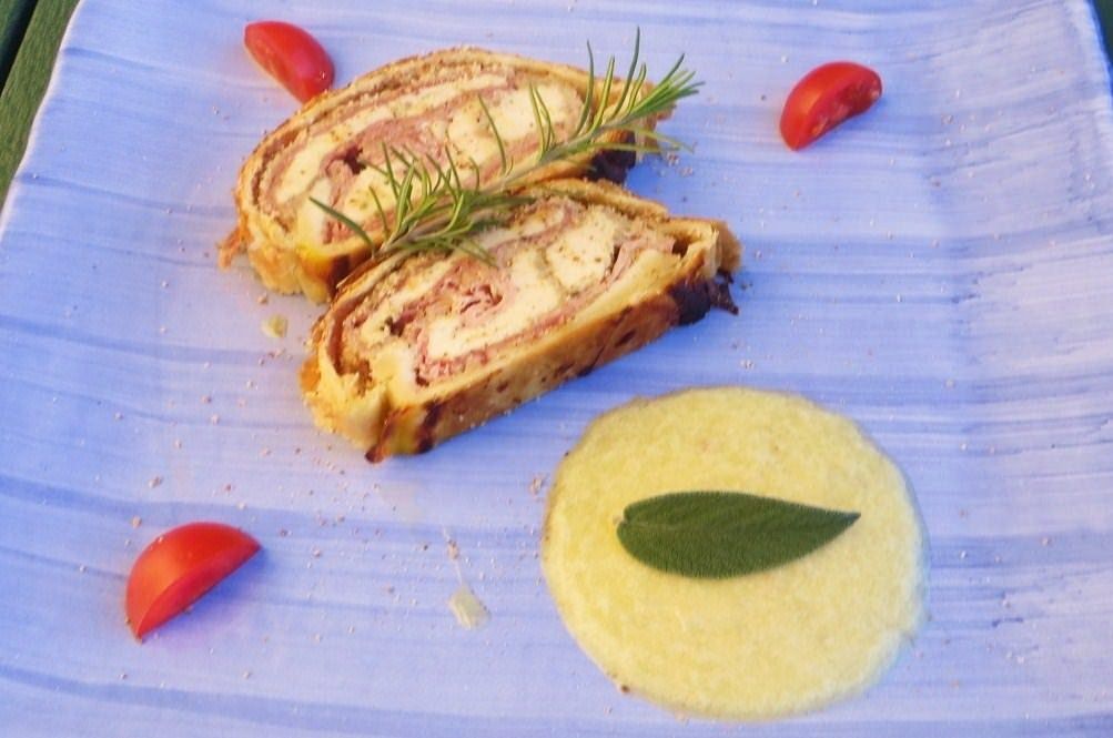 Una ricetta carina ed elegante per preparare il petto di pollo. La carne viene scaloppata e marinata con un emulsione di olio, limone, salvia, rosmarino, sale e pepe, poi avvolta nel proscitto cotto e lella pasta sfoglia. Se preferite il pesce alla carne potete realizzare questo Rotolo di coda di rospo, gamberi e speck.