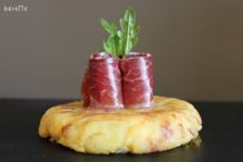 LaScamorza es un queso fresco ahumado típico de la cocina italiana elaborado con leche de vaca. Se puede elaborar de otras leches de animales, pero es menos común. Se trata de un queso muy similar a la mozzarella. Ingrediente:300gr Patata la monalisa30 gr Cebolla70 gr Queso scamorza.1 huevo entero grande.Aceite de oliva. Sal y pimienta blanca.70 gr Jamón ibérico.Rucula.
