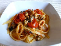 Finalmente sono riuscita ad utilizzare due grandi prodotti campani,… Scialatielli ai limoni di Sorrento del La Fabbrica della Pasta di Gragnano e Pomodorini del piennolo del Vesuvio D.O.P. di Casa Barone conditi con un sugo con murici e cozze pescate dalla mia famiglia lungo le coste di Posillipo