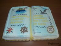 La torta, a forma di libro realizzata da Pina, è decorata con una nave, un’ancora, la rosa dei venti, un timone, perchè è dedicata a un comandante nel giorno del suo compleanno.