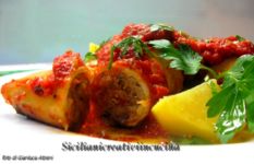 ‘Ripieno’: ecco, davanti a questa parola io mi sciolgo. Non importa cosa sia ripieno e di che cosa sia fatto il ripieno. A me piace comunque. Questi sono dei calamari ripieni delle loro codine stufate e di un impasto di pan grattato, pomodoro, capperi e prezzemolo e poi cotti in un semplice sugo di pomodoro. Due patatine lesse e la cena è pronta…non dimenticate però di comprare il pane, perché in questo caso la ‘scarpetta’ è obbligatoria…
