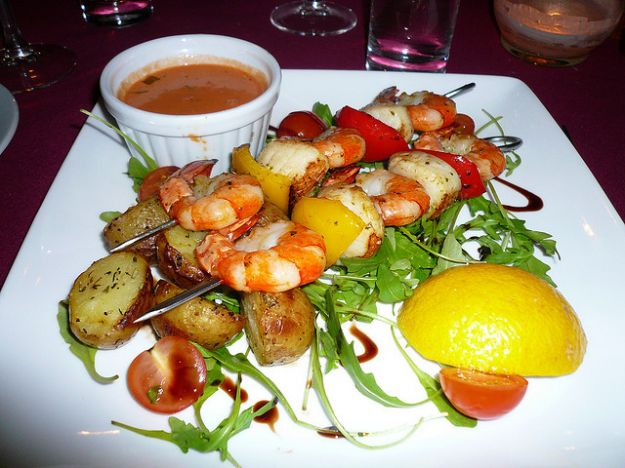 Una fresca insalata di mare, con gamberi e calamari, patate novelle, pomodorini e olive, servita su un letto di insalata verde e condita con leggero pesto di basilico, senza aglio e formaggio. [...]
