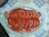 500 g di carne tritata di manzo200 g di tritato di maiale3 uova di cui 1 sodo1/2cipolla parmigiano grattugiatoprosciutto cotto2 wurstel4 sottilette100 g di piselli surgelatipangrattatooliosalepepe 1 confezione di 750 g di passata di pomodoro.Preparazione