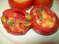 poi ho messo la polpa privata dei semi con un po' di pane raffermo..neanche tanto spezzettato in verità..grana, sale pepe, olive verdi e capperi...un po' di mozzarella...mescolato tutto e riempito i pomodori...
