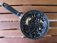 Ecco com’è ridotta la padella per le basi del gelato, dimenticata un’ora sul fuoco. Ingredienti? Due pesche nettarine tagliate a pezzi, 250g di zucchero bianco, 250g d’acqua, fuoco basso ma fisso.