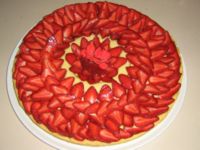 Pasta frolla (una “dose” basta), crema pasticcera fatta con 250 ml di latte (dimezzate la dose), 500 g circa di fragole, marmellata di fragole, zucchero a velo, un fiore fresco a vostra scelta per completare la decorazione.