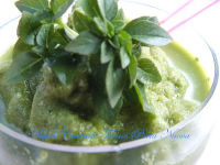 frullare basilico e pinoli con 3-4 cucchiai di spumante e aggiungervi lo sciroppo freddo,senza la scorza, il resto dello spumante e il succo di limone.
