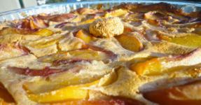 15 amaretti90 g di farina200 ml di latte120g di zucchero2 uova4 pesche nociburro per la tortiera