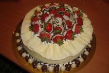 Torta al cioccolato fondente e bianco, decorata con cioccolato plastico e fragole ricoperte di cioccolato bianco. Una torta splendida.