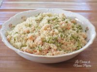 Cous cous con salmone e piselli una preparazione da servire fredda molto semplice e dal sapore delicato. Penso che sia una buona alternativa al riso o pasta fredda. Pochi ingredienti e pochi condimenti. Infatti, ho utilizzato semplicemente pochissimo olio di ottima qualità (Dante) e un pizzico di sale. Il salmone affumicato che si trova nelle buste nel banco frigo del supermercato e piselli medi in scatola. Il brodo vegetale caldo preparato al momento, con dado o preparato granulare solubile.