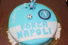 Una bella torta per il Napoli con il ciuccio di pasta di zucchero e la sciarpa. Foto da anna-viola.blogspot.it